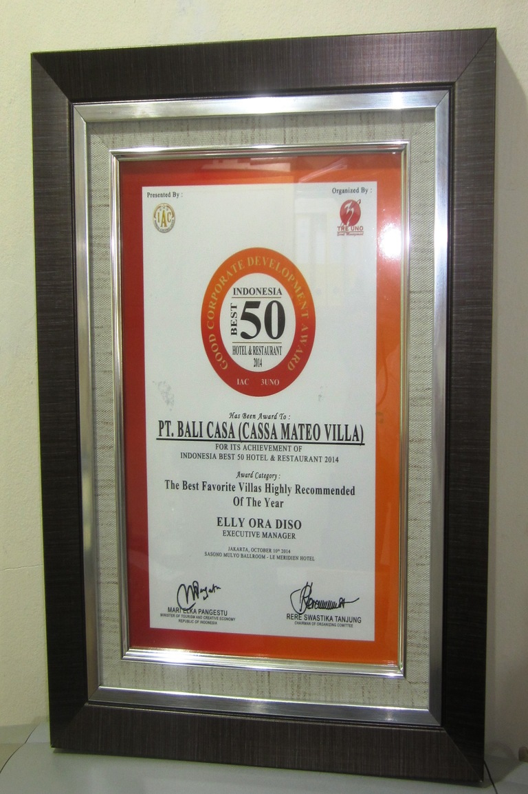 Jakarta, 15 January 2014: Indonesia Best 50 Trusted Hotel & Restaurant Award for Best 10 Trusted Villas - The Best Favorite Villas & Service Excellence of the Year.